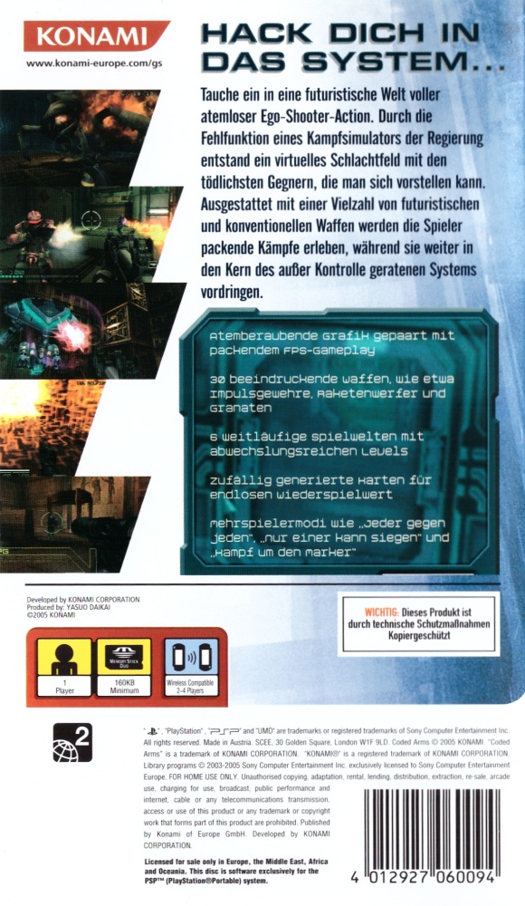 Coded Arms ist ein Science Fiction First-Person-Shooter von Konami und erschien im Jahr 2005 exklusiv für die PlayStation Portable. Der Titel war Teil des Launch Software Line-ups zum PSP Start in Europa und zählt zu den ersten vollwertigen 3D-Shootern auf einer Handheld-Konsole überhaupt.